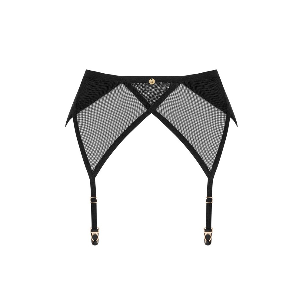 Cinto de ligas preto Nesari da Obsessive, com transparência em malha delicada e suave, combinada com material elástico opaco. Os detalhes dourados atraem o olhar, acrescentando um toque sofisticado. Ajustável com fecho de vários níveis e tiras de ligas reguláveis, garantindo conforto e encaixe perfeito.