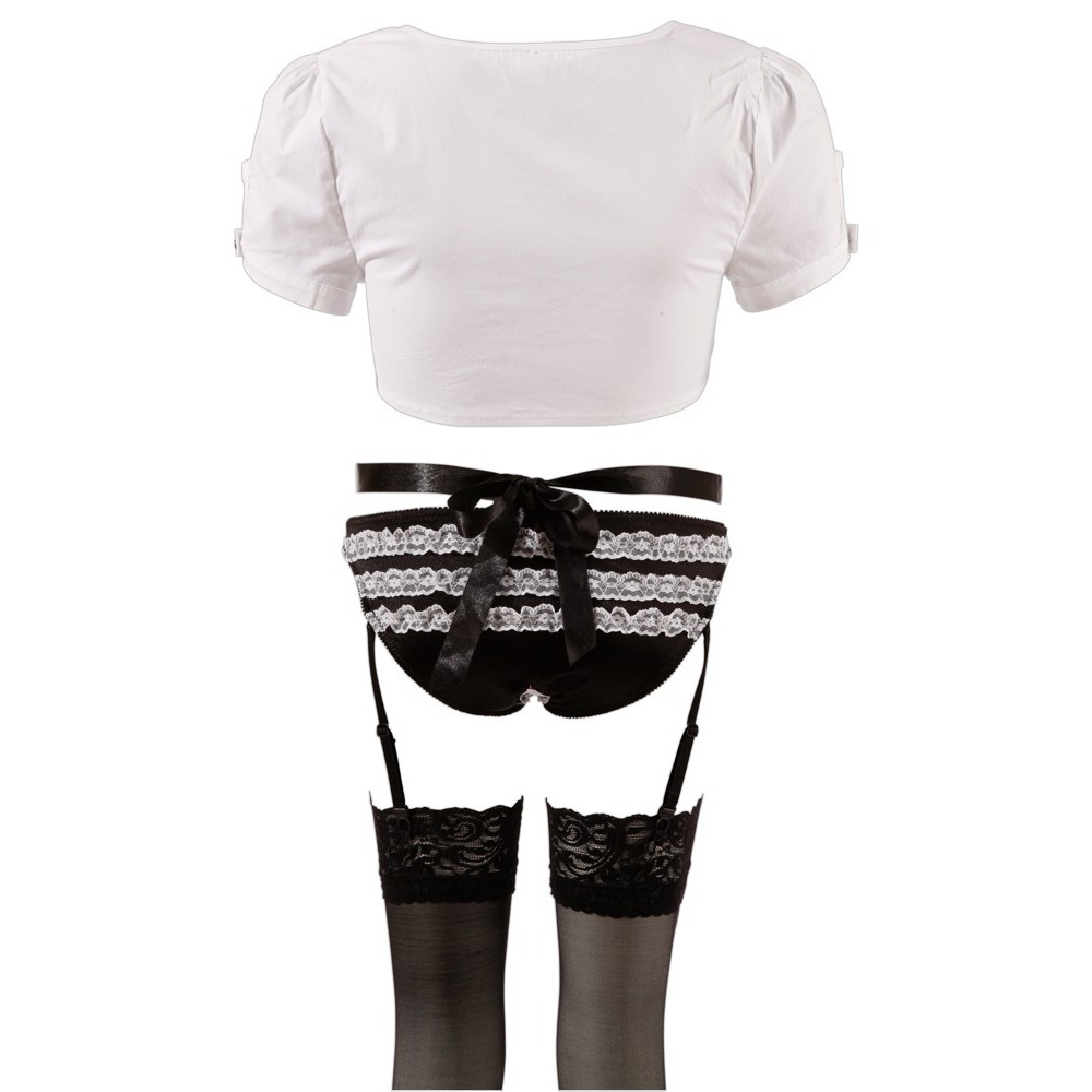 Conjunto completo para um serviço sexy, incluindo top curto, tanga com ligas sem virilha, meias, avental, bandolete e gargantilha estilo colarinho.