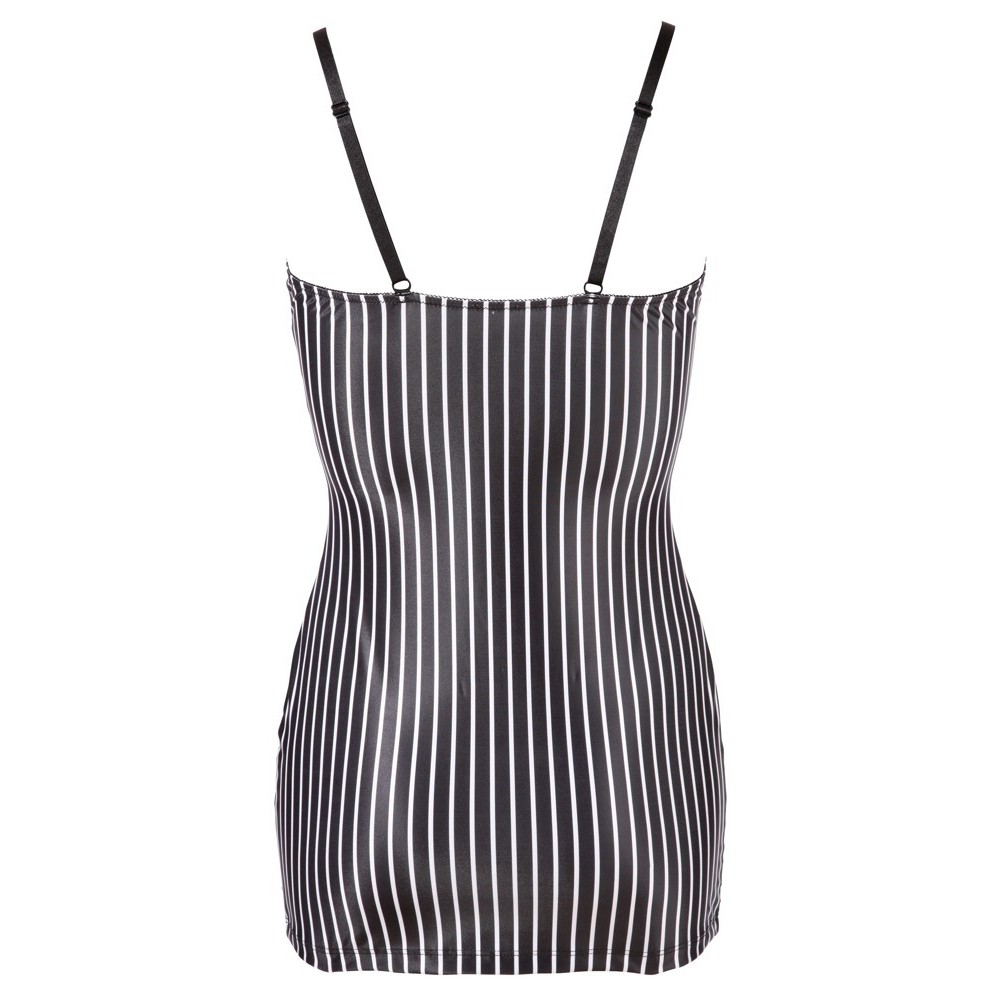 Vestido justo com alças ajustáveis, duas ligas à frente, botões decorativos e uma ligeira gola no decote. Inclui gravata.