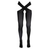 Collants pretas com uma tira na cintura que se usa de forma cruzada. Sem entrepernas.