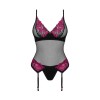 O conjunto Rosenty da Obsessive inclui corpete com ligueiros e tanga. Confeccionado em malha elástica preta macia com renda rosa subtil no decote e nas ancas, o top possui copas com aros e um pequeno elemento decorativo entre elas, além de fecho de gancho ajustável na parte inferior das costas. As alças e as tiras de ligas são ajustáveis, e a tanga opaca combina elegantemente com o corpete.