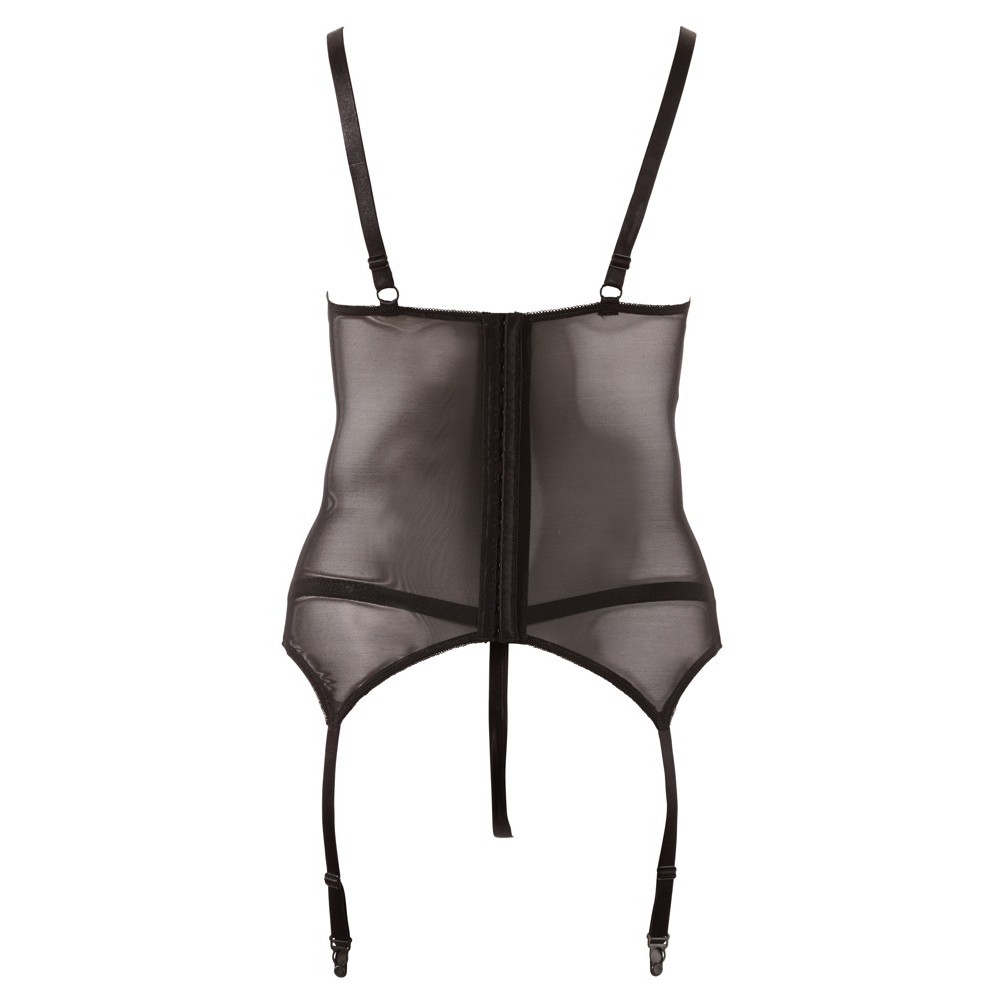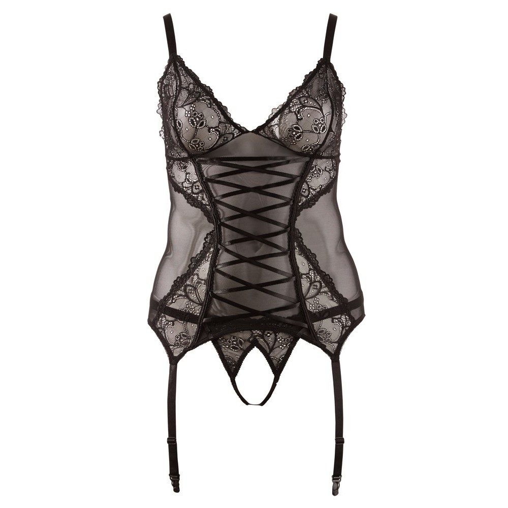 Corpete cami preto feito de powernet e renda, com alças do soutien e quatro tiras de ligas ajustáveis. Fecho de gancho na parte de trás. Inclui uma tanga de renda preta sem virilhas a condizer.