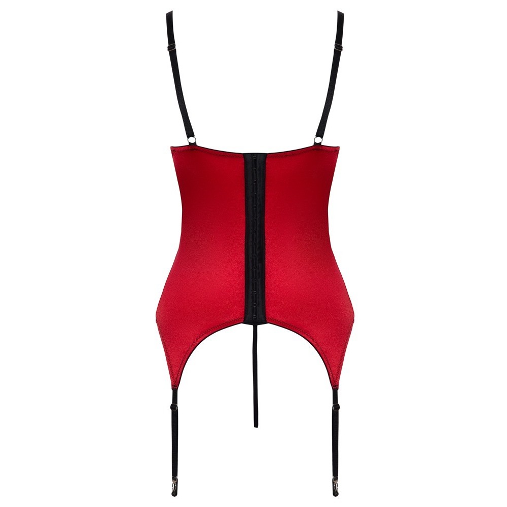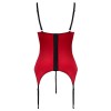 Conjunto de corpete com cami sem copas e tanga sem virilhas da Cottelli LINGERIE. Confeccionado em cetim vermelho elástico e adornado com renda delicada e elementos contrastantes em preto. Super macio e elástico, garantindo um elevado conforto ao vestir. O sutiã de varanda integrado é almofadado e realça os seios, que ficam perfeitamente enquadrados e apoiados pelas alças e pelos aros das copas. Argolas de strass brilhantes entre as copas e na parte frontal da cintura completam o conjunto. As alças e as tiras de ligas são muito elásticas e ajustáveis para um ajuste perfeito. A parte de trás da cami possui uma fila de fechos de gancho e a tanga a condizer apresenta uma abertura provocante na zona das virilhas.