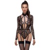 O body rio com mangas compridas da Cottelli LINGERIE é inteiramente feito de renda macia e delicada com detalhes de aspeto mate. Justo ao corpo, mas elástico e suave, garante um elevado conforto. Apresenta um decote profundo à frente, aberto até ao umbigo. A parte frontal destaca-se com um visual provocante de arnês com tiras elásticas e argolas. As costas são muito decotadas e unidas apenas por tiras elásticas decorativas. A gola de renda fecha com dois botões na parte de trás do pescoço. Possui botões de pressão na zona da virilha. As tiras para ligas são ajustáveis e podem ser totalmente removidas.