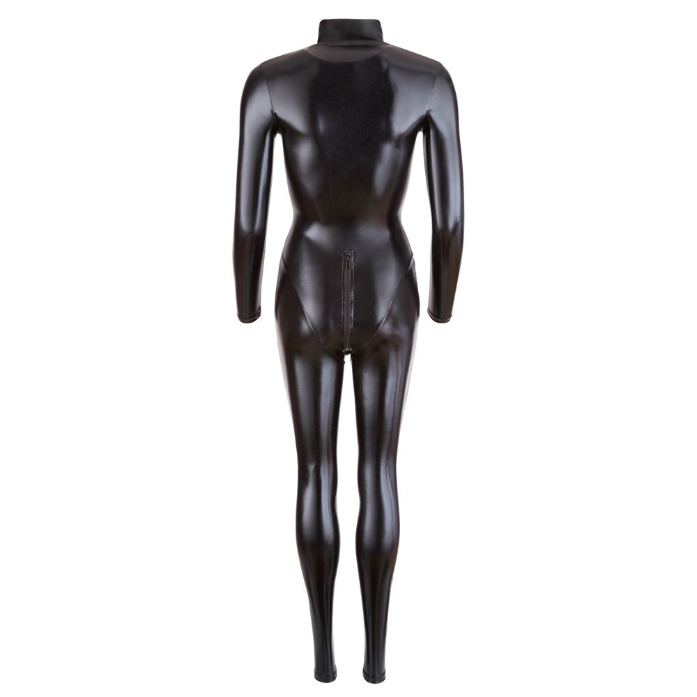 Este macacão preto, com mangas e pernas compridas e gola subida, envolve totalmente o corpo sem perder a sensualidade. O material elástico ajusta-se de forma perfeita, realçando as curvas de forma elegante. O fecho de correr largo de 2 vias começa no pescoço, percorre a entreperna e termina na parte superior das nádegas, permitindo maior versatilidade e um toque ousado.