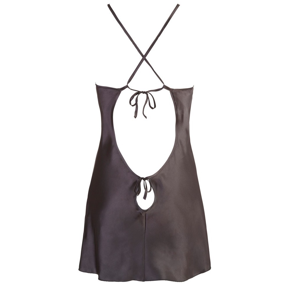 Camisa de noite curta em cetim preto brilhante, com decote profundo nas costas para um efeito sedutor. Possui alças finas ajustáveis, que podem ser reguladas na parte posterior para um ajuste perfeito ao corpo.