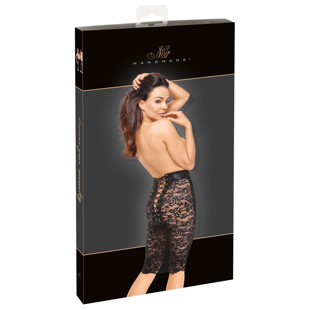 Saia lápis justa, de cintura subida, da Noir, com comprimento pelo joelho. Em preto, destaca-se pela sofisticada combinação de materiais: powerwetlook mate e brilhante na parte frontal e renda fina integral na parte posterior. O cós é igualmente revestido com renda na frente. A saia é macia e elástica, garantindo elevado conforto. A parte traseira é particularmente sedutora, com um laço ajustável e abertura desde a cintura até à bainha.