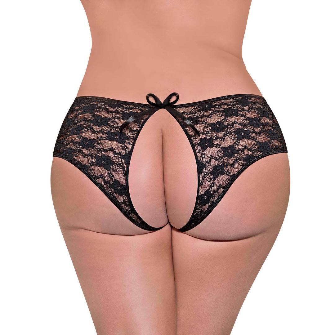 Tanga em renda com abertura traseira e virilha aberta, adornados com um laço de cetim.