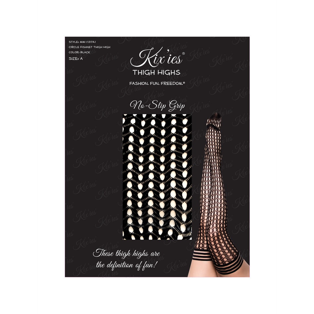 Kix'ies exclusivo em rede preta circular. Estas meias até à coxa não são para os fracos de coração e vão certamente fazer virar uma ou duas cabeças!