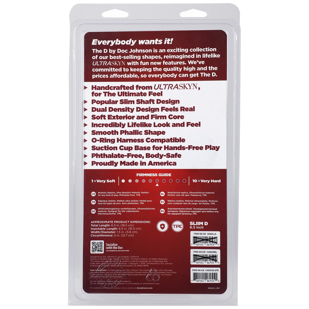 O Slim D, um dos modelos mais populares da Doc Johnson, apresenta uma largura confortável para a maioria dos corpos e está disponível em duas opções: FIRMSKYN™, para uma sensação mais firme, e ULTRASKYN™ de dupla densidade, que aquece ao toque, com um exterior macio e um núcleo firme que reproduzem a sensação real de um pénis.