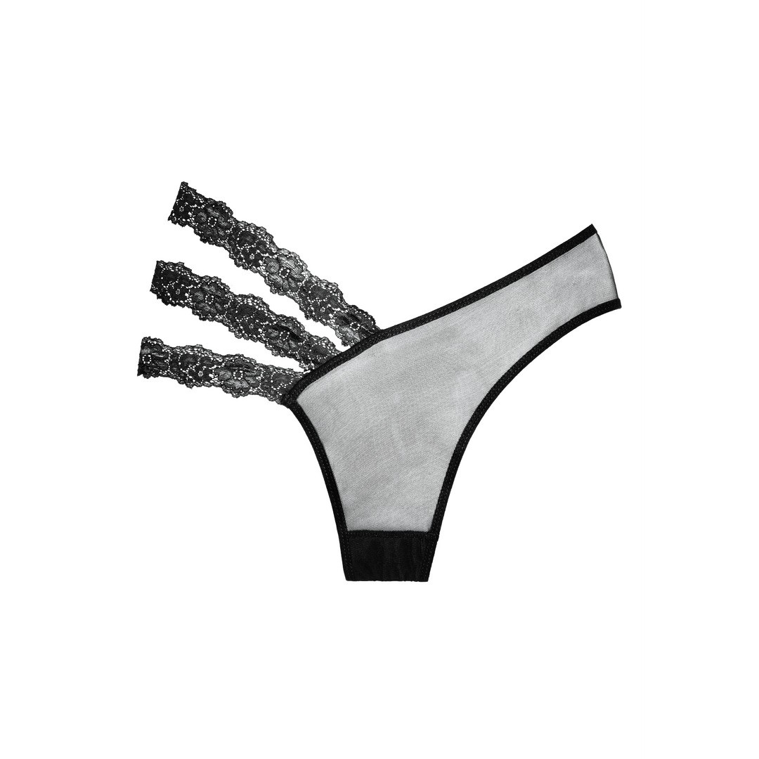 Cuequinha transparente assimétrica com faixas laterais de renda tripla em flor.
