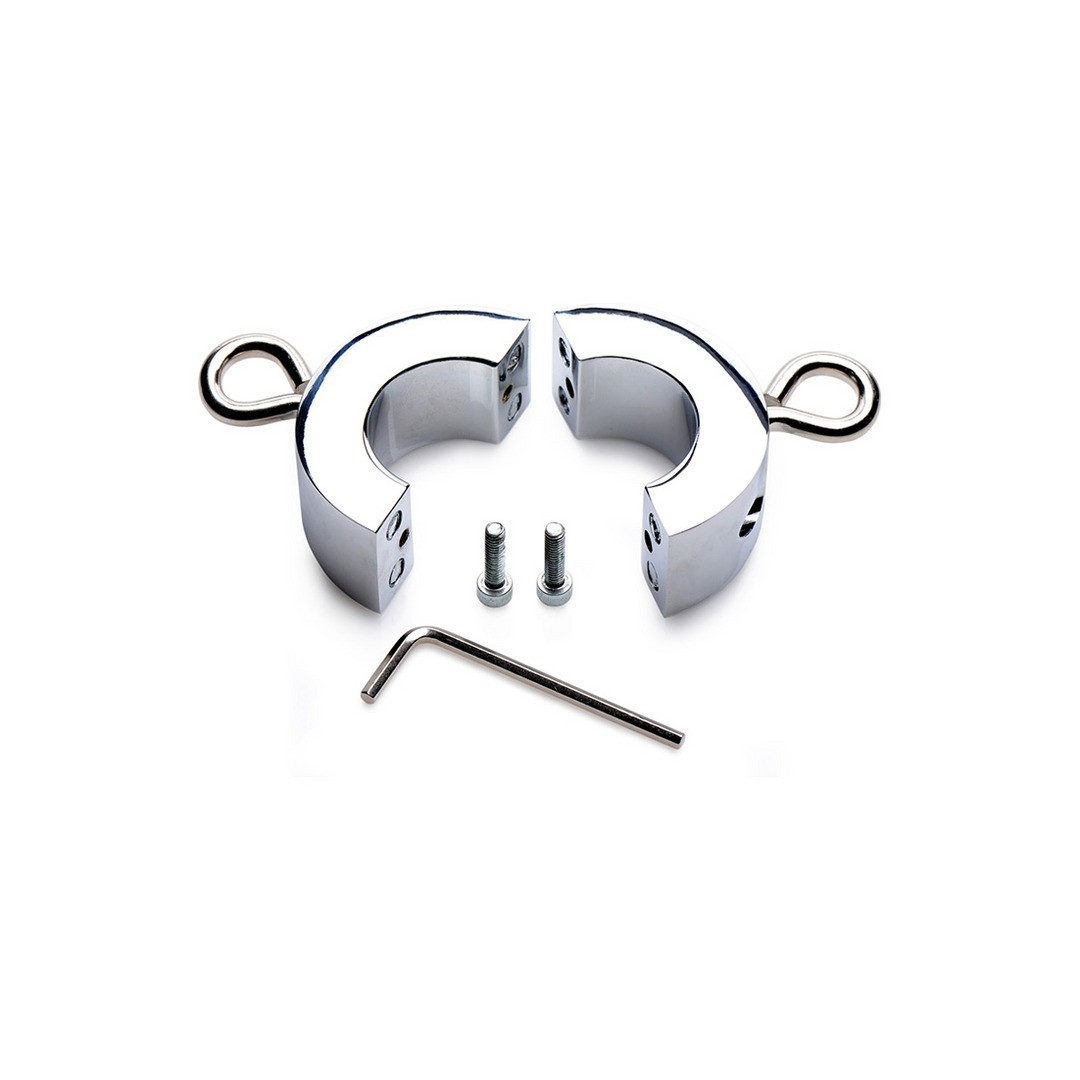 O Ball Trap é um esticador de bolas em metal, ideal para os amantes de BDSM que apreciam jogos de estimulação testicular. Com um peso de 220 gramas, foi concebido para puxar suavemente o saco escrotal, proporcionando uma sensação intensa e única. O anel possui dois pontos de fixação que permitem adicionar pesos ou acessórios, tornando-o a base perfeita para criar diferentes cenários durante a cena. Castigue o seu submisso pelo mau comportamento com pesos adicionais ou prenda correntes às algemas dos tornozelos para o forçar a ajoelhar-se.