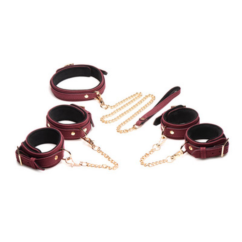 Conjunto de bondage em camurça borgonha e dourado, com algemas, coleira, trela e correntes ajustáveis.