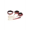 Conjunto Bondage em couro PU borgonha e dourado, com algemas, coleira, trela e correntes ajustáveis.