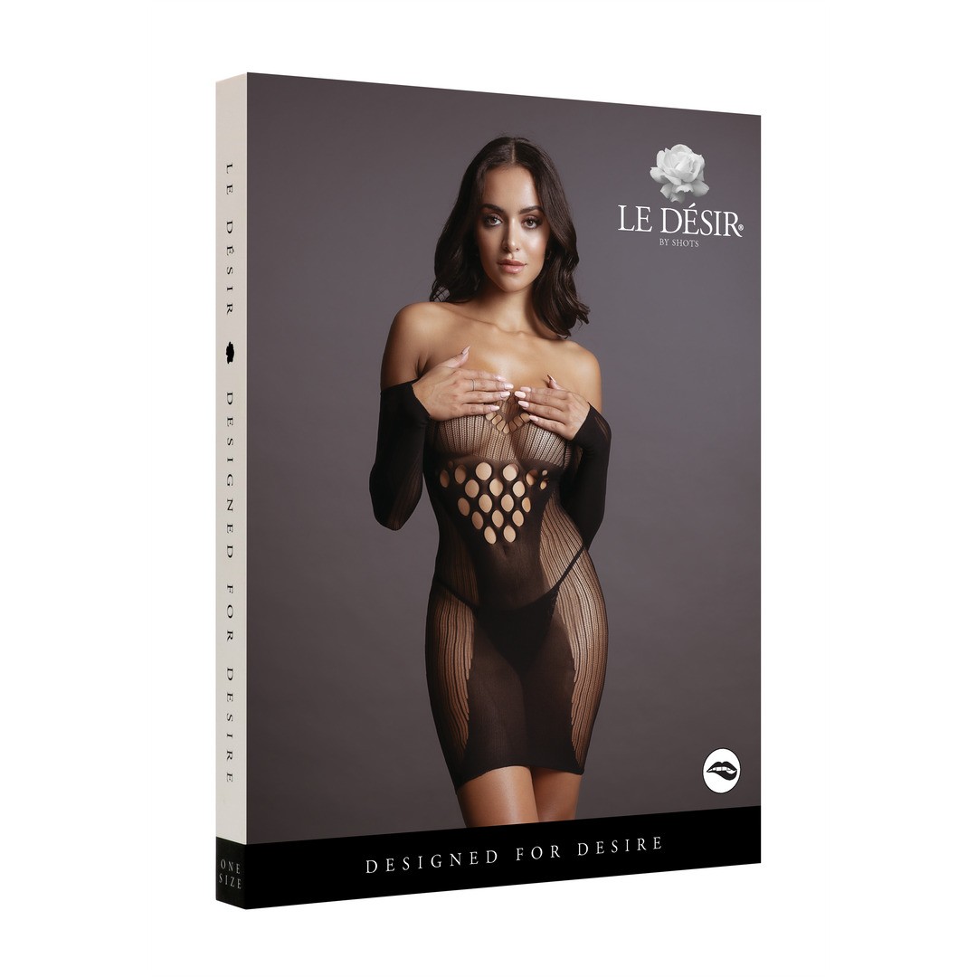 Este elegante mini vestido de manga comprida da Le Désir combina transparência e contraste para um visual sofisticado e provocante. O tecido de rede é realçado por um recorte em forma de O sob o busto e por detalhes opacos em contraste que acentuam e valorizam as curvas naturais do corpo.