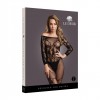 Este catsuit de manga comprida e ombros descobertos combina sensualidade e sofisticação. O padrão misto de rede e renda envolve o corpo e as pernas, desenhando uma silhueta elegante e irresistível.