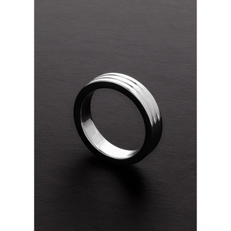 Anel para o pénis em aço inoxidável sólido com acabamento estriado. Este anel ajuda a prolongar a ereção e, simultaneamente, acrescenta intensidade extra durante a utilização.