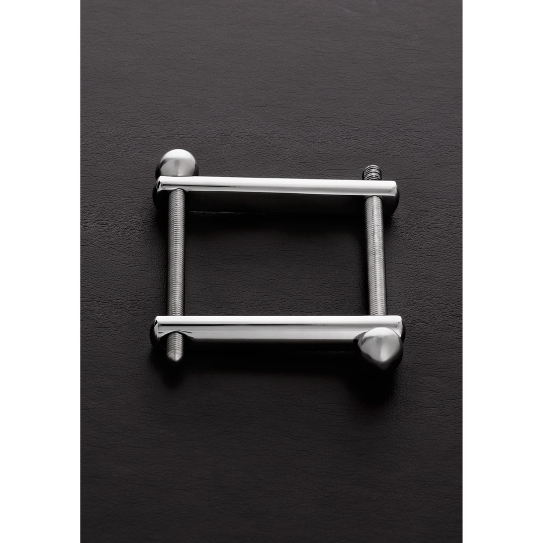 Prensa ajustável para pénis e testículos em aço inoxidável, ideal para práticas de CBT intensas.