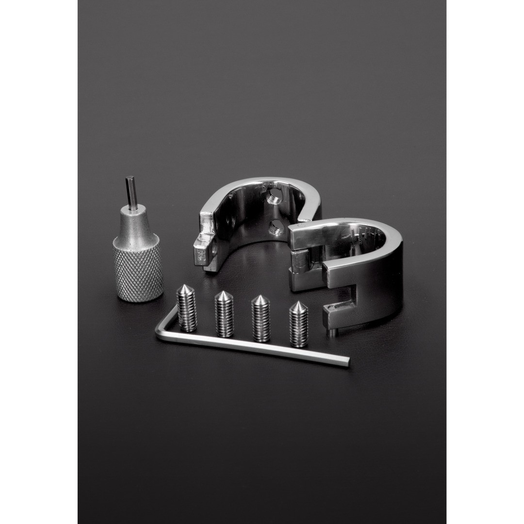Extensor oval com espigões ajustáveis em aço inoxidável para estimulação intensa dos testículos.