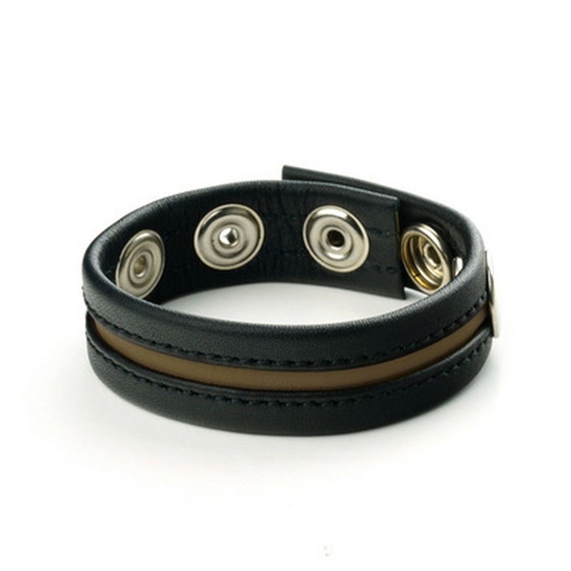 Anel para o pénis em couro com três fechos de pressão, disponível em preto com risca amarela ou vermelha.