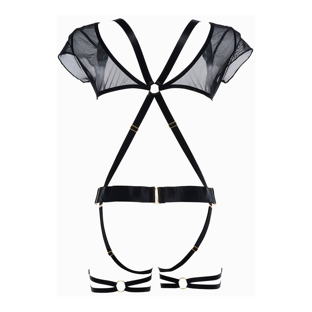 Para o look fashionista e sedutor. Definitivamente não é para o Zoom, este é apenas para ser visto pessoalmente. O top de bolero em malha com tiras ajustáveis à frente e atrás funde-se numa cueca totalmente aberta com tiras ajustáveis. Para adoçar ainda mais o visual, as tiras de ligas realçam as ancas com fitas ajustáveis nas pernas.