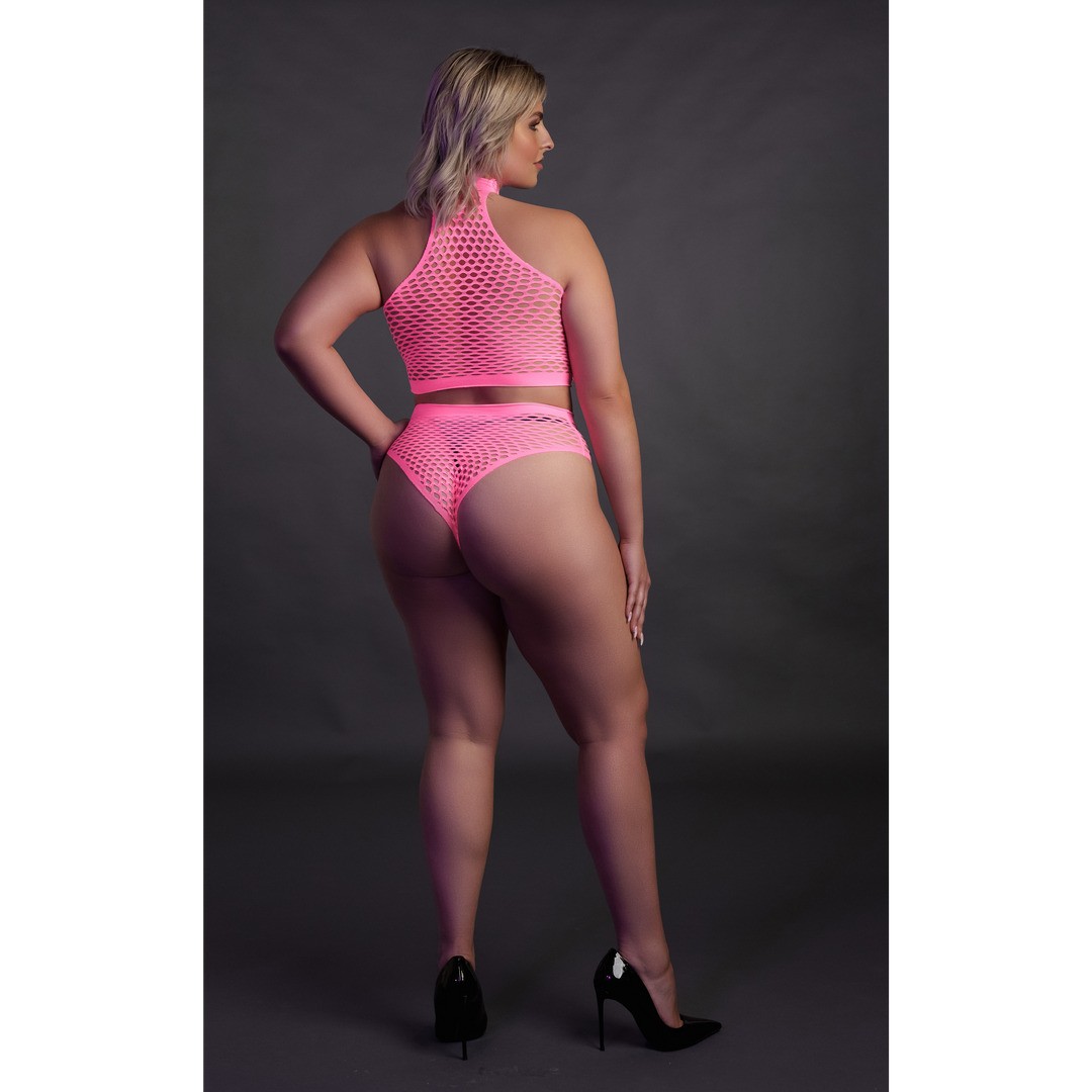 Liberte a sua deusa interior com os materiais ativados por UV, que fazem este conjunto brilhar no escuro, garantindo que se destaque com um toque sedutor de mistério. Escolha entre rosa néon ou verde néon para um visual vibrante e cheio de personalidade.