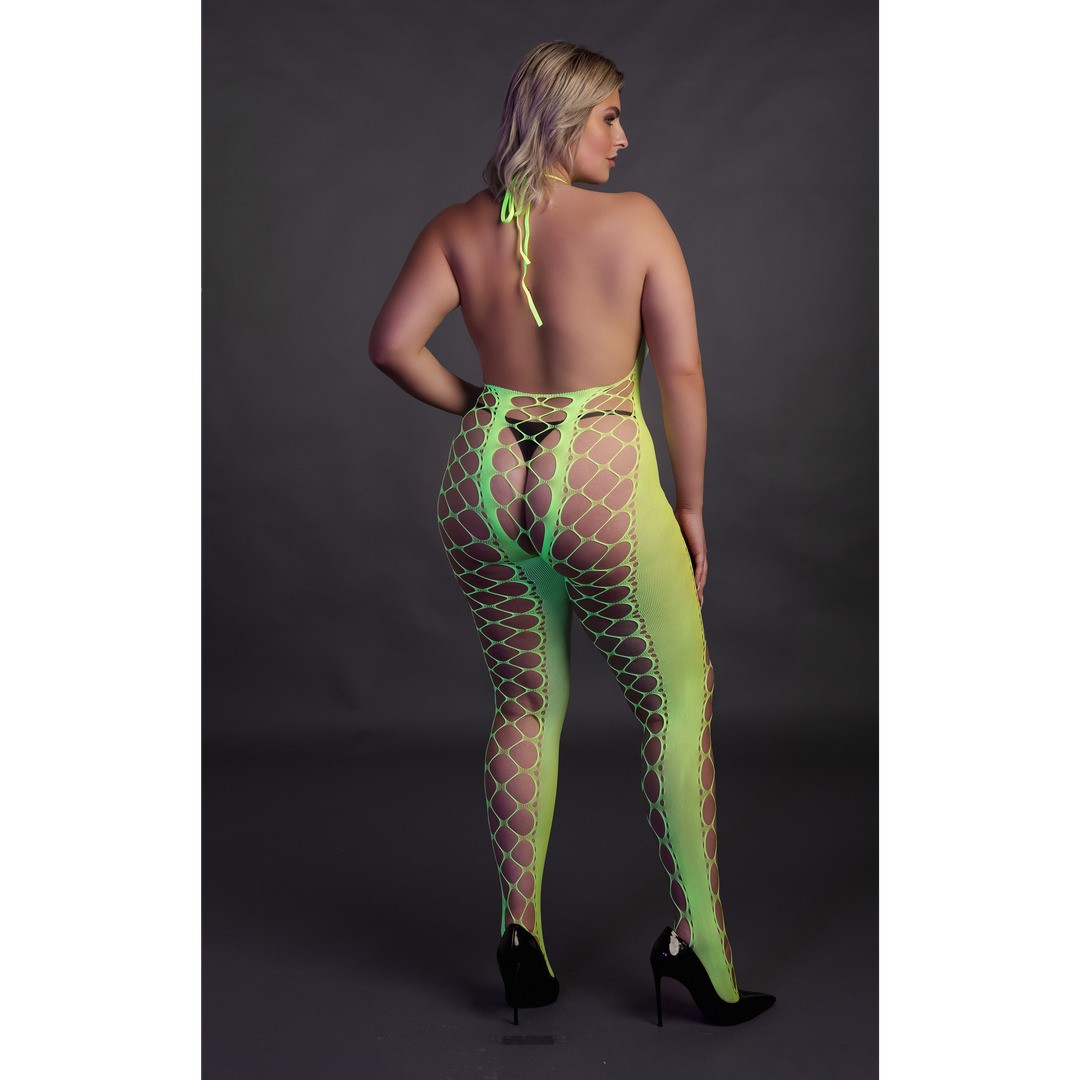 Catsuit Neon UV com decote halterneck e entrepernas aberto, em rosa ou verde néon, para um look ousado que ilumina a noite.