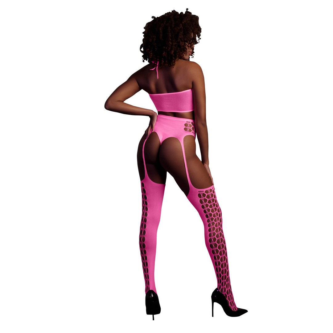 Conjunto Néon UV de duas peças com top curto e meias de ligas — sensual, vibrante e feito para brilhar à luz UV.