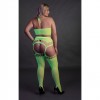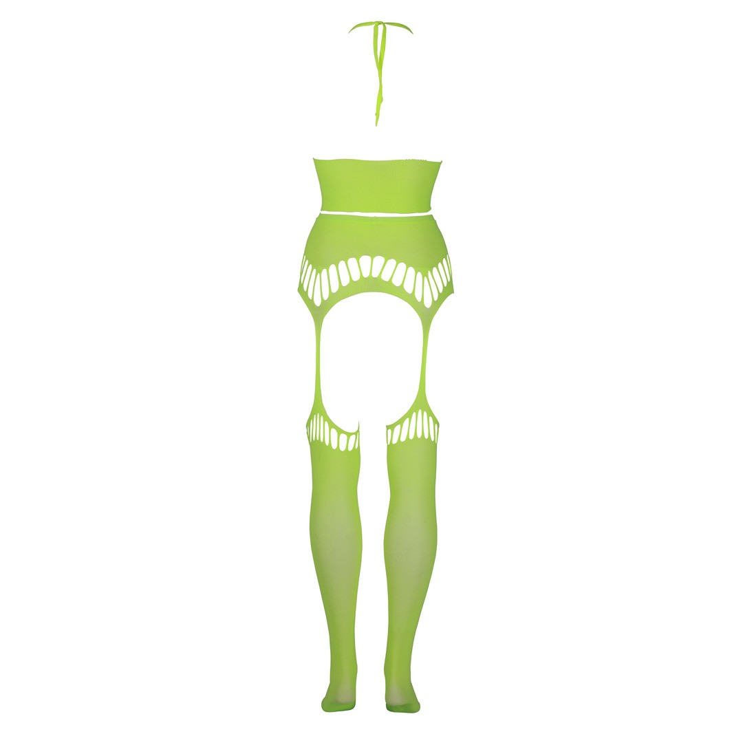 Conjunto Neon UV com top halterneck e meias de ligas — sensual, vibrante e feito para brilhar quando as luzes se apagam.