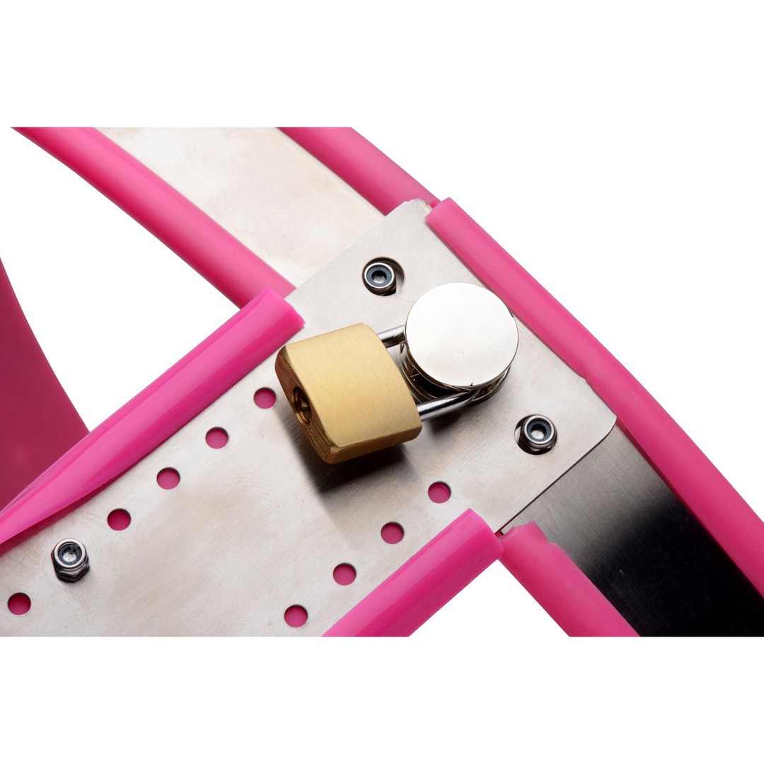 Cinto de castidade em aço inoxidável com forro de silicone rosa, confortável e ajustável para submissão segura e discreta.