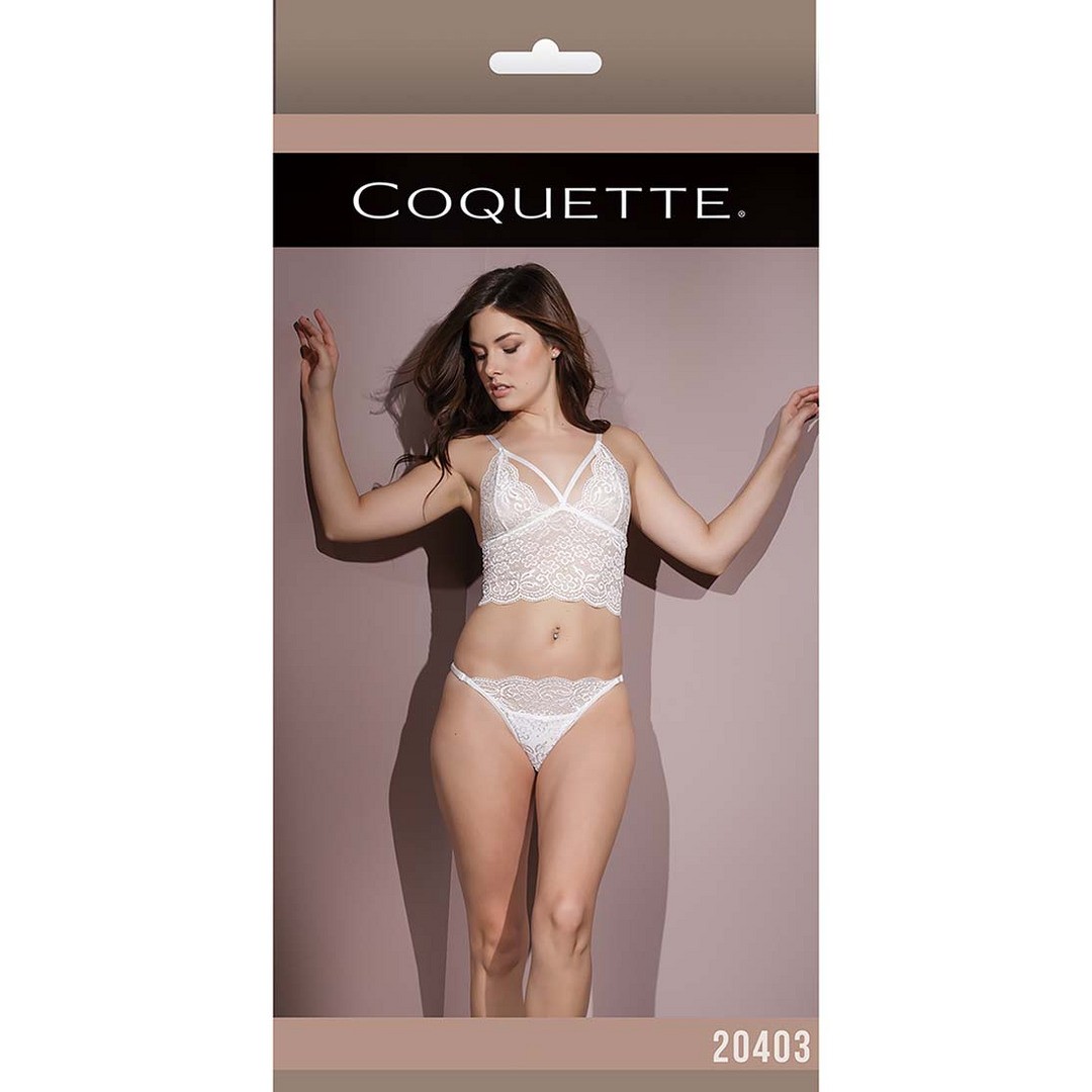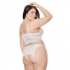 Sutiã com decote profundo e tanga sensual sem entrepernas. O tecido de renda com vieiras é elástico. As copas do bralette apresentam pormenores de tiras e a tanga possui tiras ajustáveis, permitindo adaptar o tamanho.