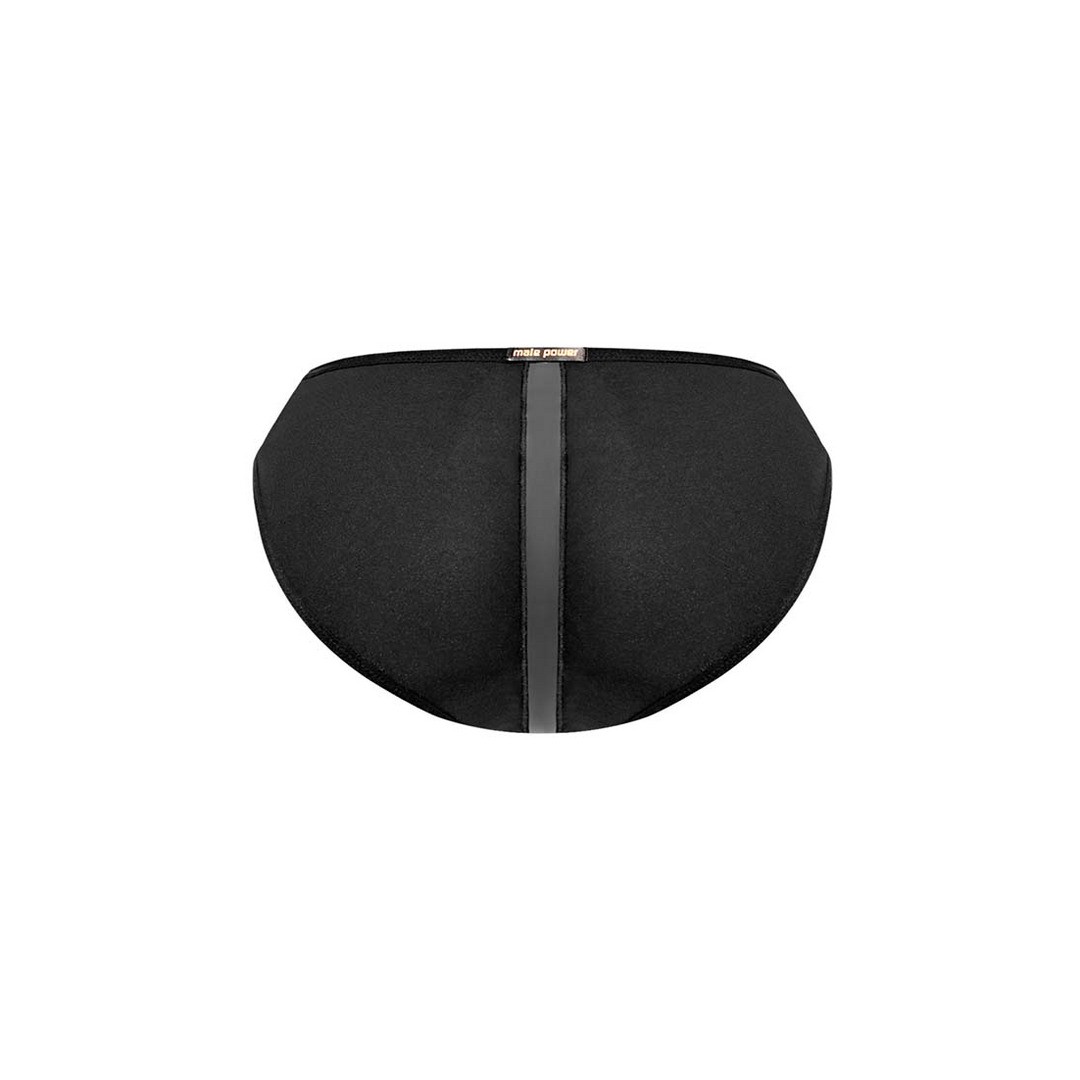 Da coleção Landing Strip da Male Power, o slip tipo biquíni apresenta um fino elástico de pelúcia na cintura e nas pernas, uma faixa de inserção em ónix mate tom sobre tom na bolsa e na parte de trás, e uma etiqueta metálica decorativa com o logótipo da marca no cós traseiro.