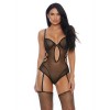Body sensual com copas com aro, alças cruzadas e tiras de ligas integradas para um visual provocante.