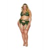 Conjunto de 3 peças em renda elástica com detalhes metálicos, composto por soutien, cinto de ligas e tanga sensual.