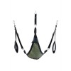 Este baloiço de tecido verde foi concebida com uma forma triangular e tecido de camuflagem. Ajusta-se com 3 ou 4 pontos de fixação. Inclui os seguintes acessórios: 4 ganchos com mosquetões metálicos, apoios almofadados para os pés (11 cm de largura) e uma almofada triangular preta (24 x 20 cm).