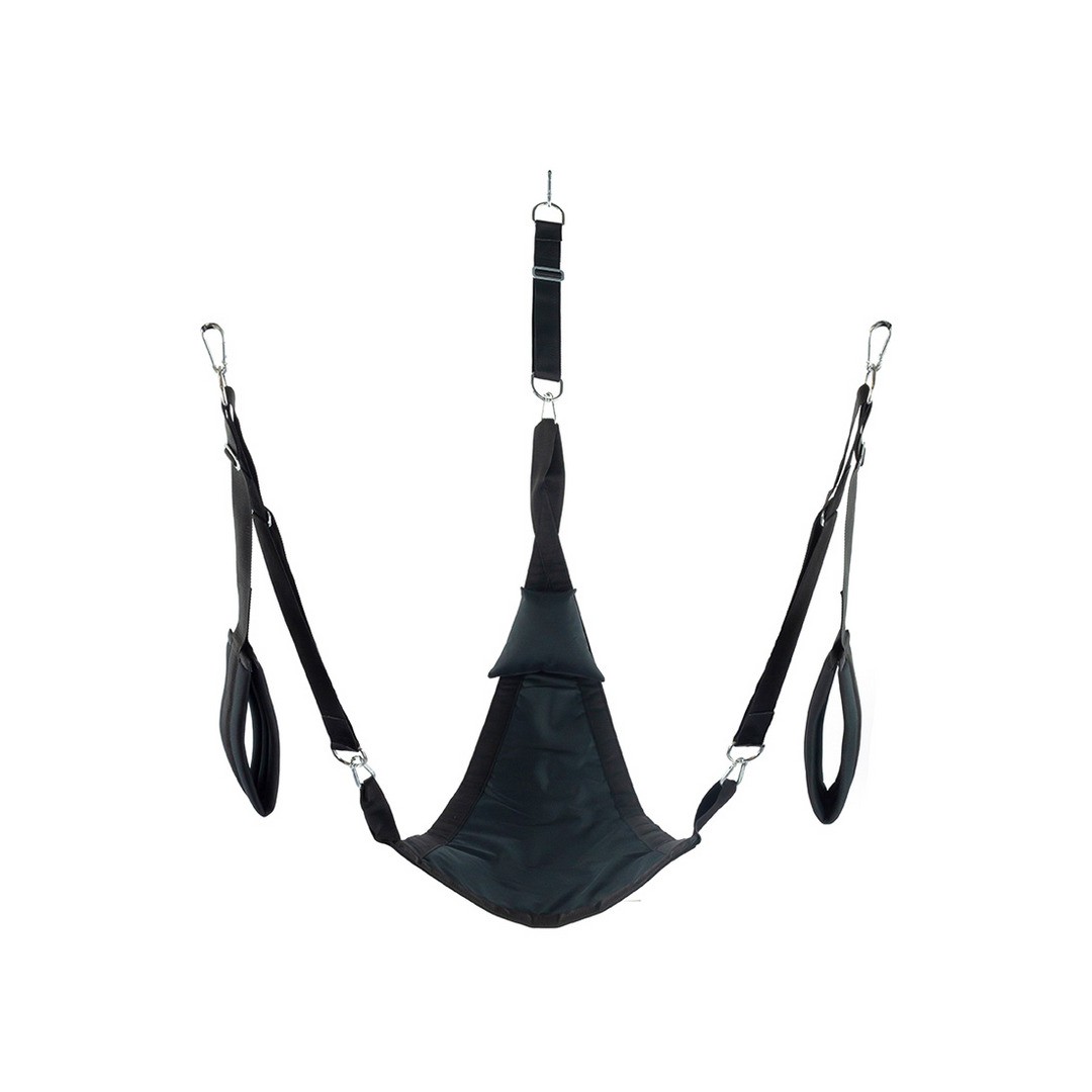 Este baloiço de tecido preto foi concebida com uma forma triangular e tecido de camuflagem. Ajusta-se com 3 ou 4 pontos de fixação. Inclui os seguintes acessórios: 4 ganchos com mosquetões metálicos, apoios almofadados para os pés (11 cm de largura) e uma almofada triangular preta (24 x 20 cm).