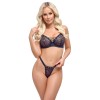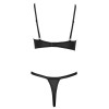 O sutiã e a tanga com aros é um conjunto preto da Cottelli LINGERIE. As copas e a parte da frente da tanga são feitas de renda elástica e também têm ilhós decorativos prateados. Entre as copas com aros, há um pouco de laço decorativo. Existe um fecho de gancho na parte de trás do sutiã para o ajustar. As alças também podem ser ajustadas para um ajuste perfeito.