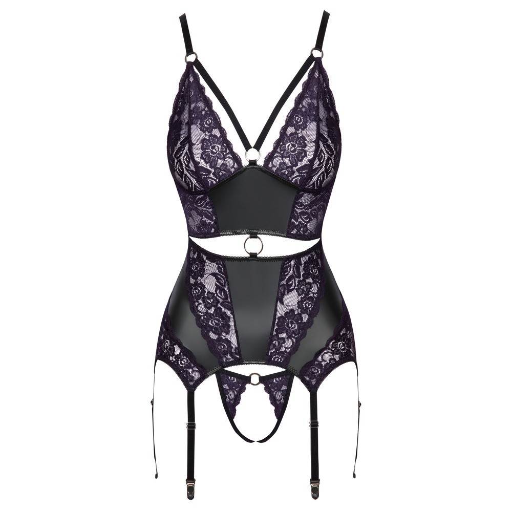 Corpete e tanga sem virilhas num conjunto da Cottelli LINGERIE. Feito de material preto mate com inserções de renda na frente numa elegante cor roxa escura. O conjunto é macio e elástico, o que significa que é extremamente confortável de usar. Há alças elásticas decorativas e um anel entre as copas de renda macia. Há também uma argola prateada sobre o recorte que se encontra na parte da frente da cintura. Existe também uma outra argola na cintura do string. As alças do sutiã e as 6 alças do suspensório são ajustáveis. O fecho de gancho duplo na parte de trás também é ajustável. O string pequeno é sedutoramente sem virilhas.