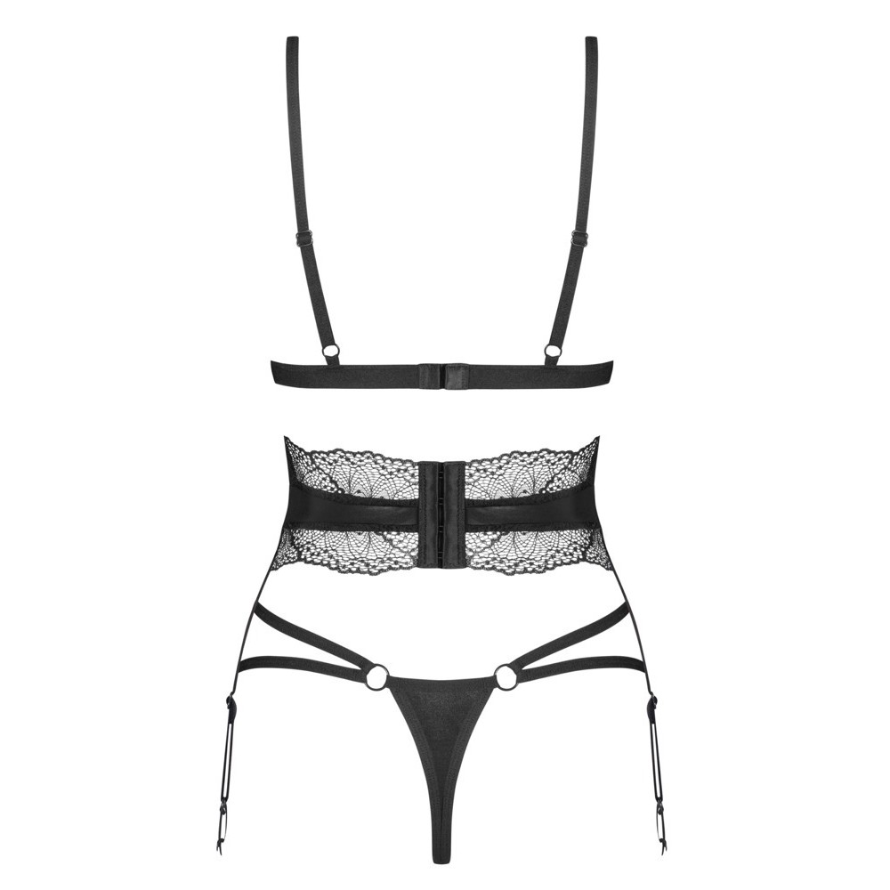 Conjunto Lobellis da Obsessive composto por sutiã, tanga e cinto de ligas, confeccionado em material preto delicado – aveludado e macio – combinado com tecido elástico e renda elegante. Todas as peças são macias e elásticas, garantindo um ajuste confortável. A tanga apresenta um discreto pormenor decorativo na parte frontal. As alças do sutiã e do cinto de ligas são ajustáveis para um encaixe perfeito.
