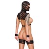 O top de copa aberta inclui uma máscara para a cabeça e é complementado por duas algemas e algemas para as coxas.