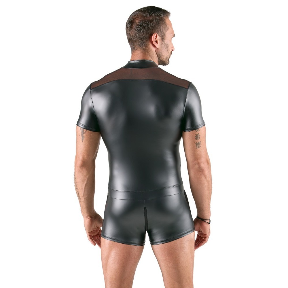 O macacão preto curto e justo à pele da Svenjoyment é feito de uma mistura elegante de material opaco de aspeto mate e tecido transparente. O material elástico adere suavemente à pele e é muito confortável de usar. O fecho de correr de 3 vias começa na gola alta, passa pela virilha almofadada e pára na parte superior das nádegas. O fecho pode ser aberto quando e como for necessário.