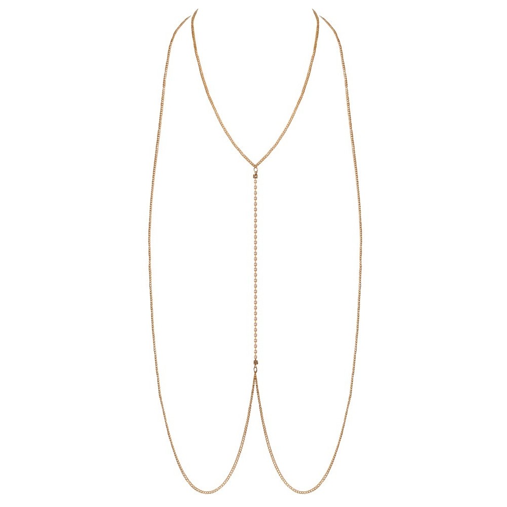 O Body Chain dourado da Cottelli ACCESSOIRES é composto por 2 longas correntes douradas unidas por uma corrente de strass com 19 cm de comprimento. Com uma corrente de extensão (15 cm de comprimento) que pode ser ajustada com o fecho de gancho. Pode ser usado no corpo nu para um look elegante e erótico. O body chain também pode ser usado com fatos de banho elegantes ou com fatos justos.