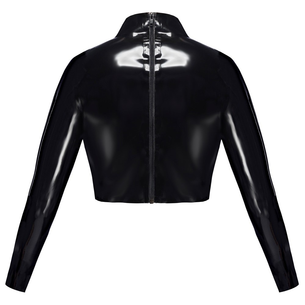 O crop top da LateX é feito de látex preto natural (espessura de 0,35 mm) e também tem um grande recorte na frente para mostrar os seios de uma forma deslumbrante. O top é elegantemente elegante e tem uma gola alta e mangas compridas. Tem um fecho de correr a todo o comprimento na parte de trás, o que facilita a colocação e a remoção.