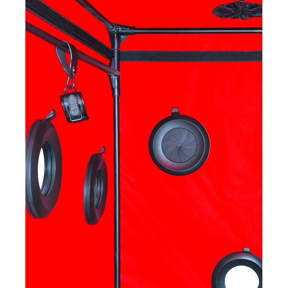 A caixa fechada BDSM, Scandale da Secret Dome, é a diversão perfeita para glory hole, jogos obscuros, role play cativante e outras fantasias. A caixa robusta, com o seu sistema de encaixe de tubos e a robusta tampa opaca, pode ser rapidamente montada e estará pronta a usar num instante. O orifício para a cabeça tem um fecho de correr e uma gola larga e ajustável. Existem 9 orifícios (3 de cada lado) que podem ser completamente fechados com abas. O acesso também é cómodo através da porta lateral com fecho de correr. 2 ventoinhas e iluminação LED asseguram uma ventilação e uma luz óptimas na caixa que, de outro modo, seria completamente escura. Existe um tapete macio no chão para maior conforto. As algemas e as algemas de tornozelo incluídas (1 conjunto de cada) podem ser colocadas no interior conforme necessário. As imobilizações almofadadas e macias podem ser colocadas e ajustadas rapidamente com os fechos de fivela.