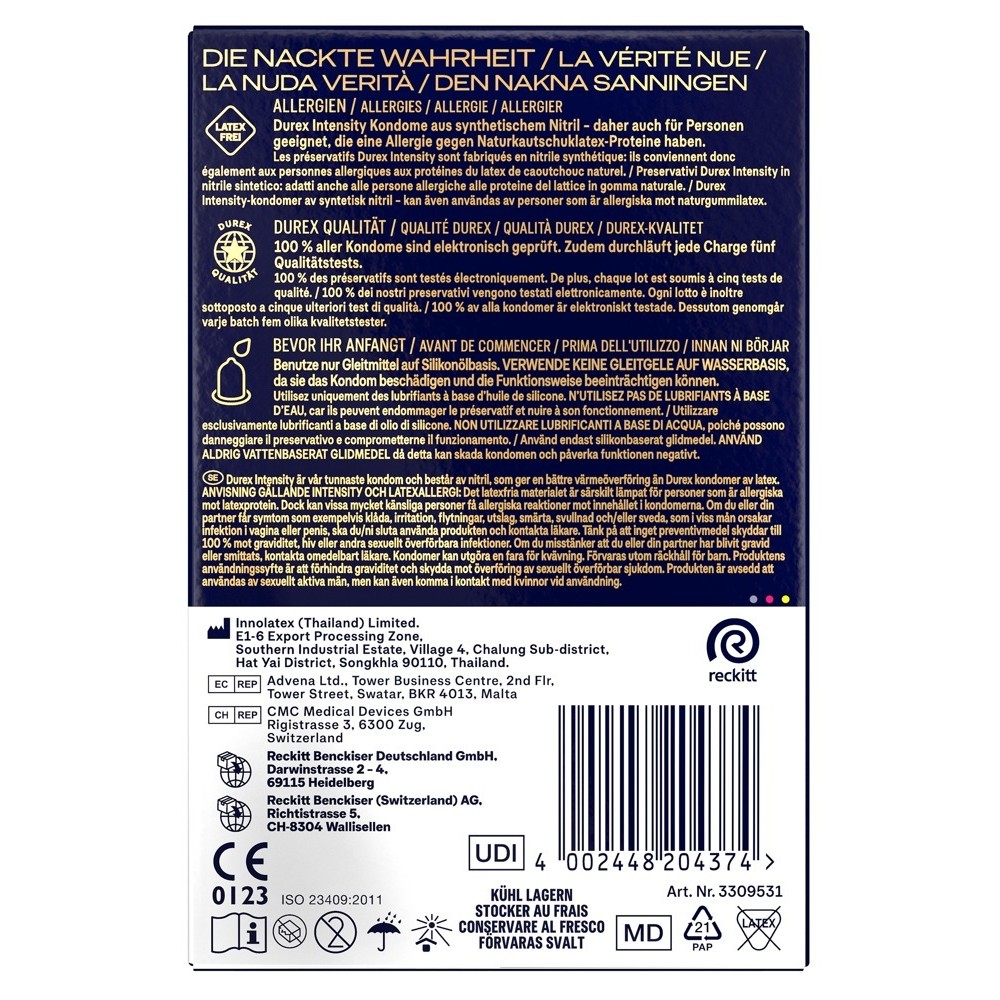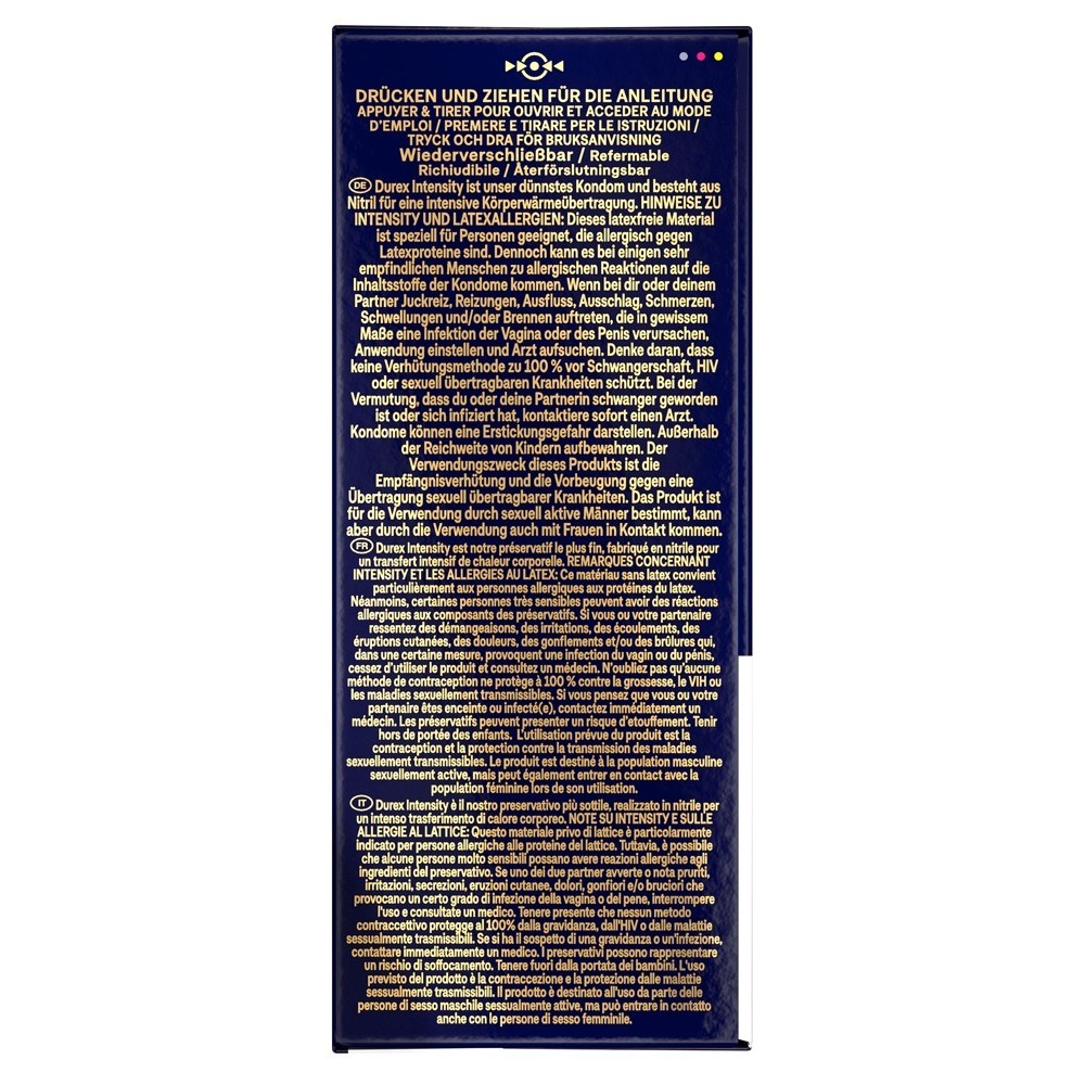 Os preservativos ultra finos e sem látex Intensity da Durex são fabricados em nitrilo, proporcionando uma transferência intensa do calor corporal e oferecendo uma sensação tão natural que quase parece não se estar a usar nada — como se apenas se sentisse o parceiro. Estão generosamente lubrificados com lubrificante à base de silicone.