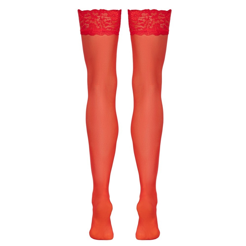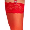 As meias vermelhas aveludadas e macias da Cottelli LEGWARE têm uma renda elástica de 9 cm de largura à volta da parte superior. 20 denier. Certificação Oeko-Tex.
