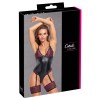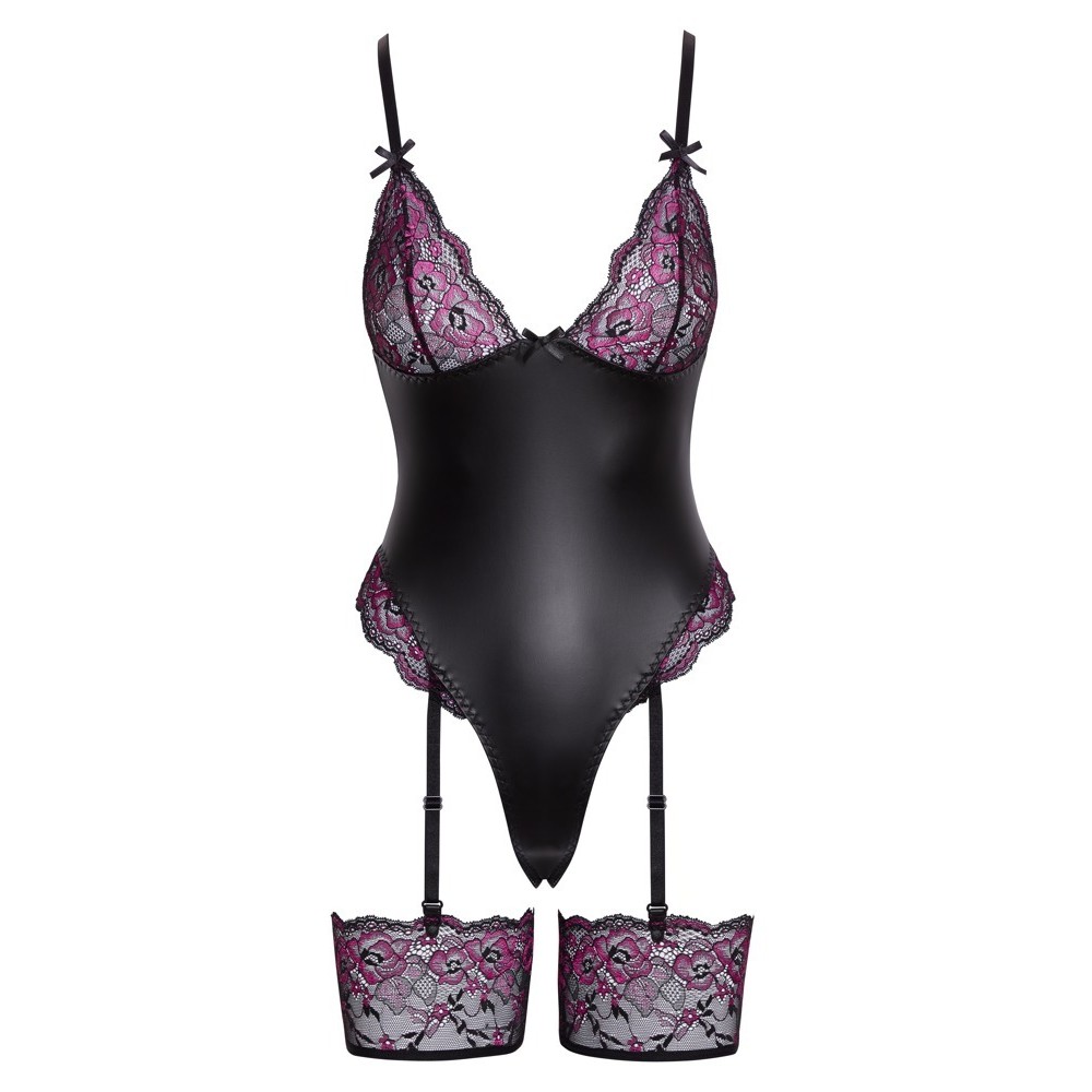 O belo body de ligas da Cottelli LINGERIE tem tiras e ligas amovíveis. O body é feito de um elegante material preto mate combinado com delicadas rendas em duas cores (rosa e preto). É também decorado com pequenos laços pretos. O corpo da tanga macia e elástica tem copas de renda sem fios e recortes extra-altos nas pernas, decorados com renda. Existe também um prático fecho de pressão na zona das virilhas. As alças do sutiã e do suspensório podem ser ajustadas. As alças das ligas também podem ser removidas. As ligas largas e elásticas também podem ser usadas sozinhas.
