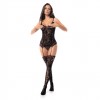 Catsuit em rede com motivos florais, ligas e meias incorporadas, para um visual ousado e elegante.