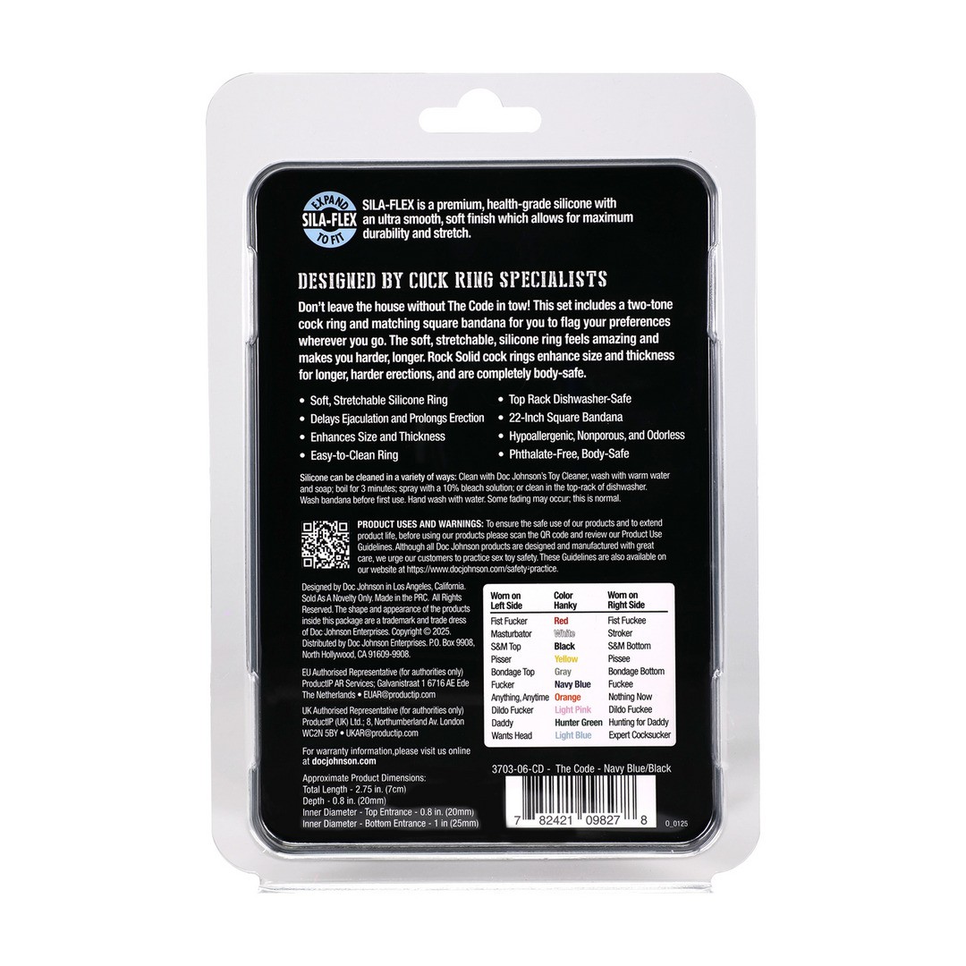 Não saia de casa sem o The Code! Este conjunto inclui um anel para o pénis bicolor em silicone macio e elástico, juntamente com uma bandana quadrada a condizer, para que possa sinalizar as suas preferências onde quer que vá.