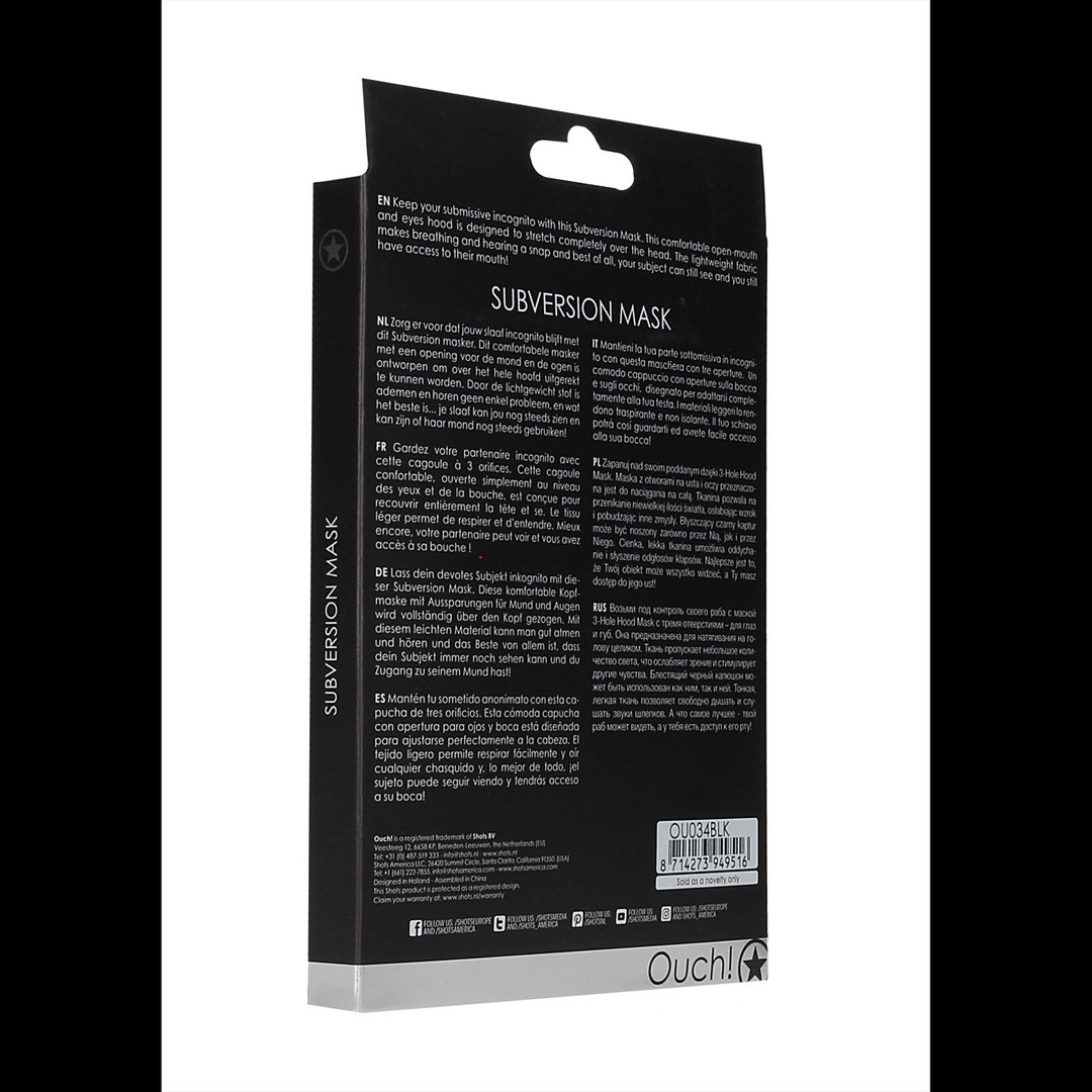 Mantenha o seu submissivo no anonimato com a máscara de subversão. Esta confortável máscara ajusta-se perfeitamente à cabeça e fecha-se facilmente na parte de trás graças ao fecho zíper.